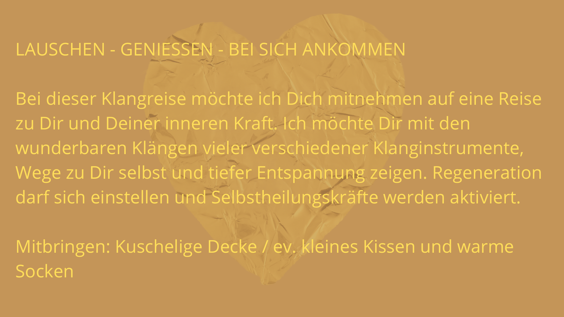 Die Stille geniessen, den Klängen lauschen, sich in die innere Welt begeben und entspannen. Bei diesen Klangreisen möchte ich Dich mitnehmen auf eine Reise zu Dir und zu Deiner inneren Kraft. Ich möchte Dir mit den wunderbaren Klängen verschiedener Klanginstrumente (wie z.B. Klangschalen, Sansula, Koshi, Auraglocke, Klangspiel, Feng und Tam Tam Gong, Handpan, Solfeggio Phase Drum, Cabalonga Nuss Shaker, Klangliege / Liegemonochord, Aureliophone und Rainmaker), Wege zu Dir selbst und tiefer Entspannung zeigen. Regeneration darf sich einstellen und Selbstheilungskräfte werden aktiviert.