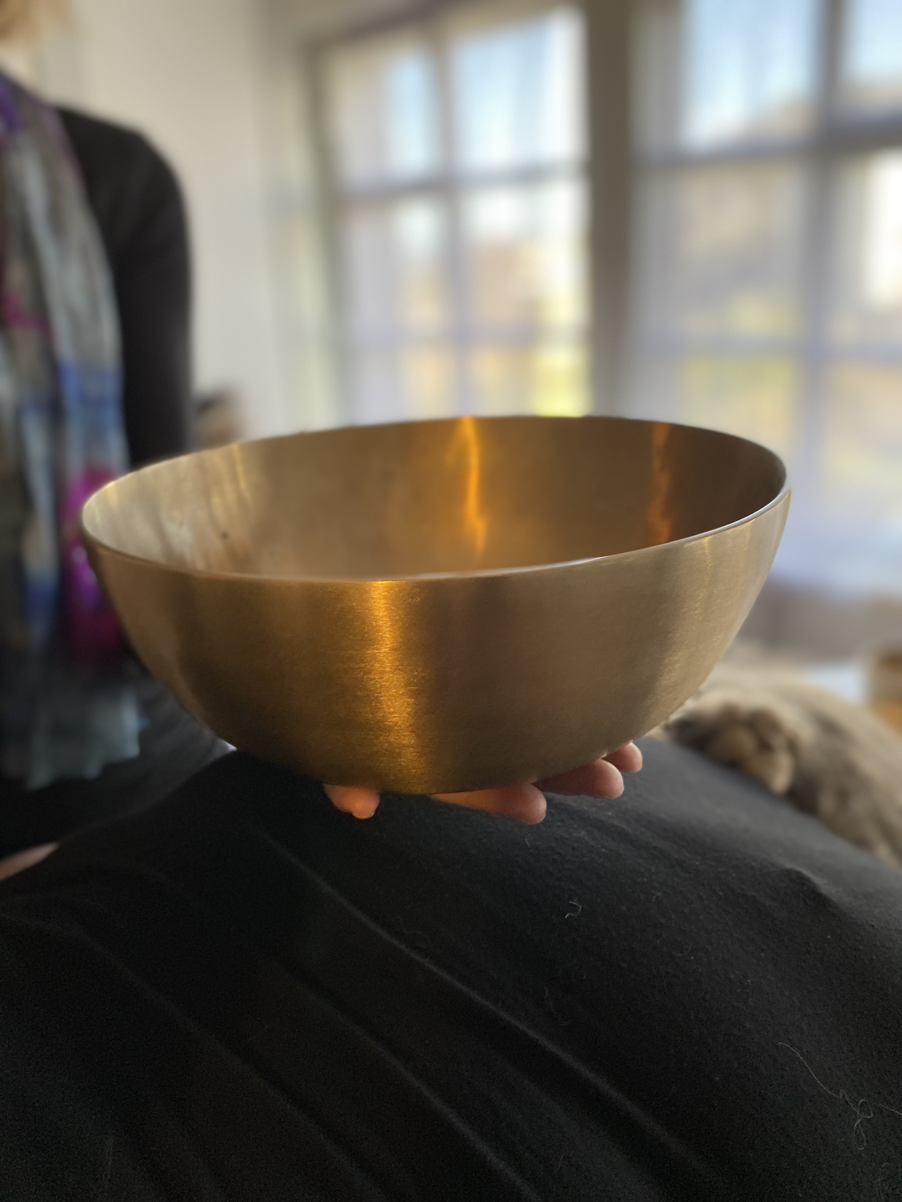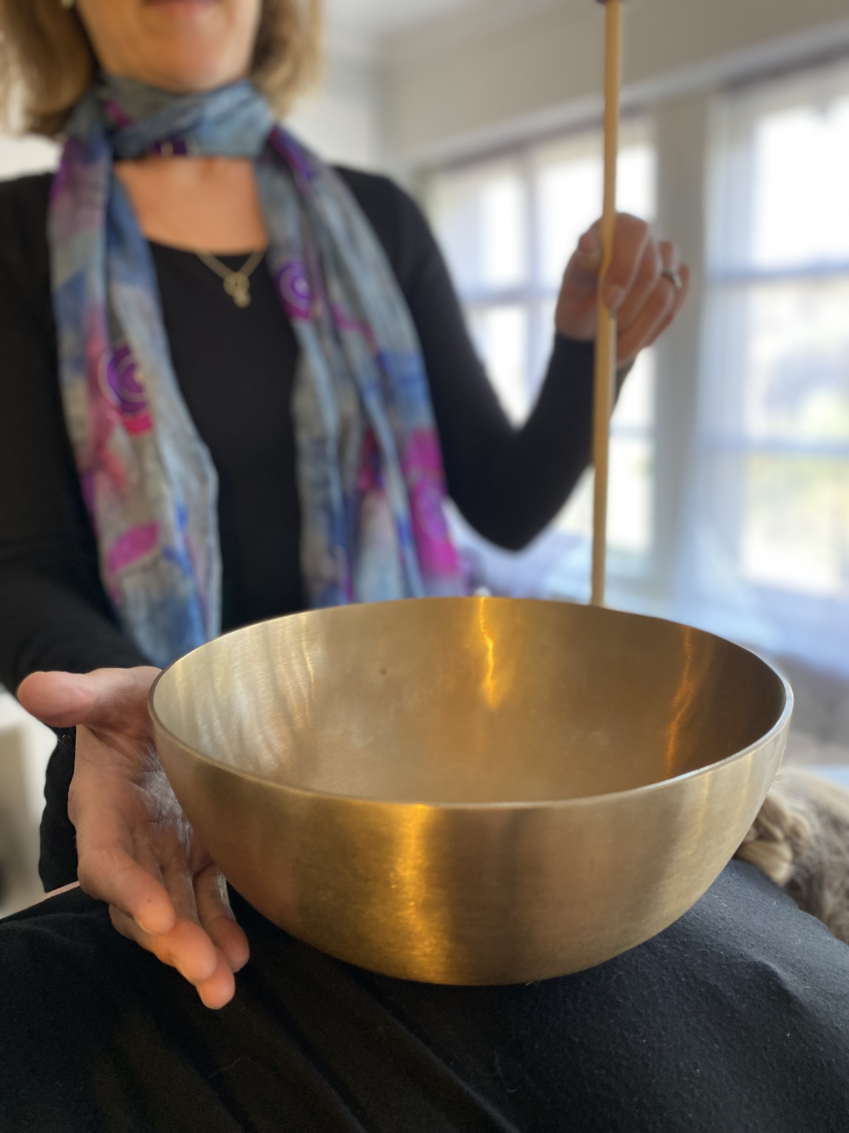 Die Klangtherapieschalen werden auf den Körper gestellt und sanft angeklungen. Die harmonischen Klänge beruhigen den Geist, die rhythmischen Vibrationen lockern den Körper.